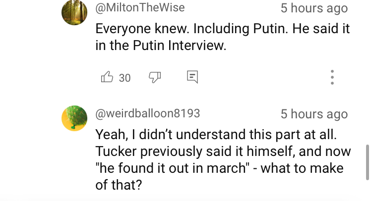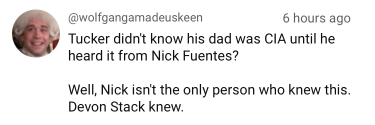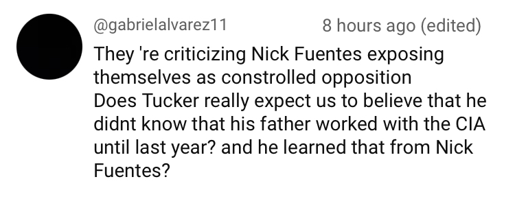 With Tucker in his interview with Candace, he did this thing (I’ve seen him do several times) where he runs his hands through his hair and won’t look at the person. He did this casually on the interview posted today with Candace, while at the same time saying he didn’t know his Dad was CIA until he found out through Nick Fuentes. Full stop. Wait, what? When I told this to my Papa and Grammie, Pop goes, “that’s B.S.”. This was the first time I wanted to go straight to the comment section just to see what people were saying in defense of Nick. I wasn’t disappointed. People said it was laughable that Tucker only JUST found out about his Dad being CIA and through Nick no less. “Come on, man!” I knew his Dad was CIA. Didn’t most of us? But Tucker didn’t? Yeah, just no. Keep running your hands through your hair. Get a load of the comments:
