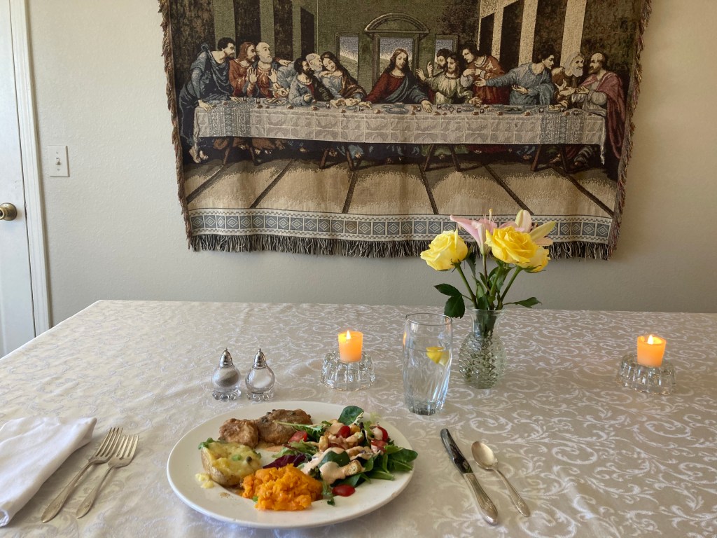 And when housing for me was found, it was him who ran out and confirmed I was taken care of. When I say several parishioners, who were angels if you ask me, all made sure I knew I was not alone and provided for, is no hyperbole. In fact, that day, I was picked up by the dear lady who ran the guesthouses and she sat me down at a banquet table with fancy silverware and China dishes where I was served a Gourmet Meal, tea and dessert as I sat directly across from an image of the Last Supper with a vase of yellow roses in the center of the table (my favorite color rose and I prayed to Therese beforehand for that very color).