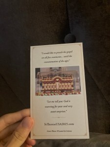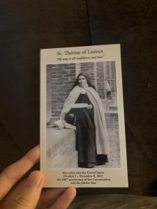 After we recited our prayer together, none other than Therese’s Canticle of Love began to play and I prayed specifically for an answer in a private prayer to Therese and when the song and prayer ended, someone randomly began speaking over the intercom, loud speaker and all, with a quote from Therese, which led both Aflavia and I to cry like babies. It was like receiving a direct answer from Therese directly over the microphone which also made me laugh because it was essentially an answer to my question, and so something Therese would do. The quote, more or less, was this: