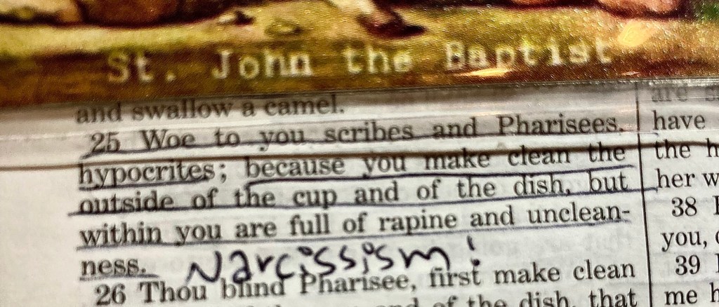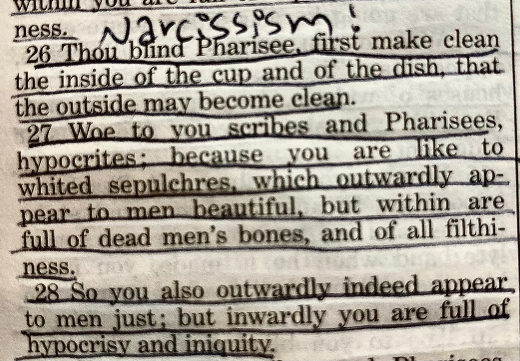The first time I see it, I give them the benefit of the doubt. Second time I see it, it’s a coincidence. Third time, it’s a pattern. And you know that saying: “when a person shows you who they are, believe them.” Narcissism is entirely biblical and we see Our Lord battle this behavior in the Pharisees ALL THROUGHOUT His public ministry. He leaves plenty of spicy examples of how to deal with these “hypocrites.”