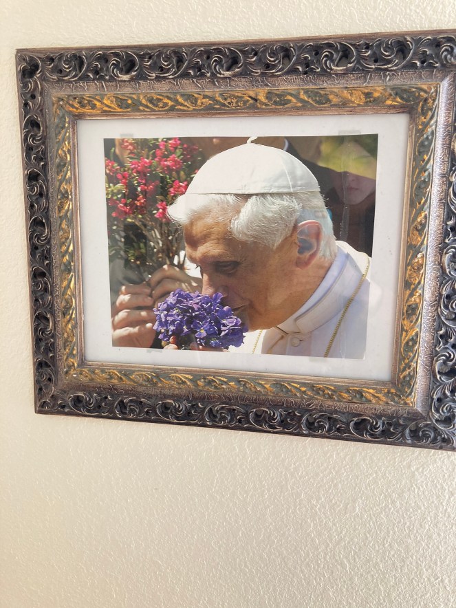 I had just completed a novena to Pope Benedict XVI as he had only been dead about a month, and as I was walking around the retreat house hallway I looked up and my eyes landed on a framed photo of Pope Benedict I had never seen before. He was smelling a purple flower in a “garden”. We all know what the color purple symbolizes in the Church: