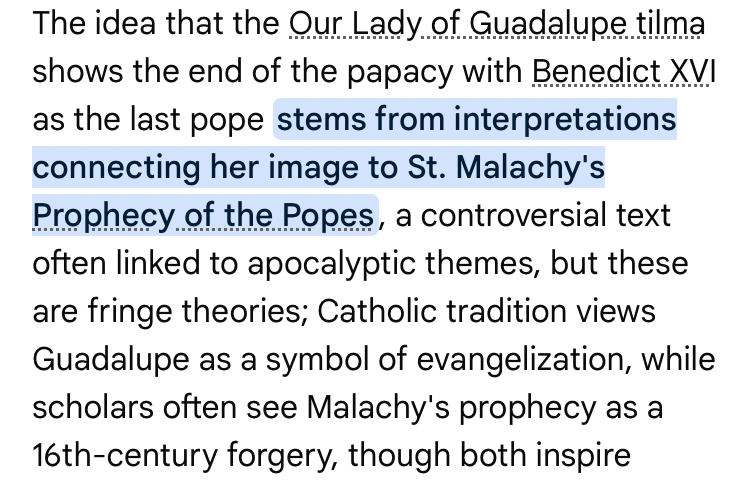 It was discovered that both the number of stars that appear on Our Lady’s mantle on St. Juan Diego’s tilma (cactus fiber cloak) corresponds to the number of popes after Clement VII, pontiff when Our Lady of Guadalupe appeared in 1531, to Benedict XVI (46). 46 stars= 46 popes, and I was amazed at what some of the comments read about Bergoglio and Prevost at the end of the article: