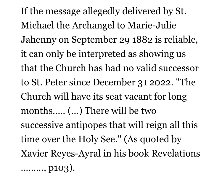 Hmmm… I don’t know… maybe all THIS is why Pope Benedict XVI wouldn’t go to the “canonization” of Paul VI? Just a guess. Look, I have already told my readers my position: I believe the chair has been vacant since the death of Pope Benedict XVI, and we are in the current state of interregnum (the longest the Church has ever had was three years, and we are now past that) making Bergoglio and Prevost definite anti popes predicted by Our Lady and Marie Julie Jahenny.