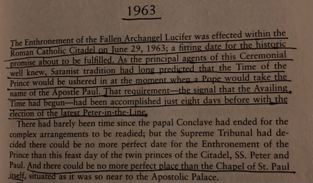 It’s how I found the prophecy of Ezechiel and what he predicted would happen to the Church, before “the wedding”. This time, I sensed a draw to open my cabinet of art supplies and some stored books, and I pulled out Malachi Martin’s Windswept House. Opened, and what did I find? Prepare to be disturbed but affirmed, that Saint Paul is the Church’s best man, and little pouty satan (loser, and father of losers) knows it: