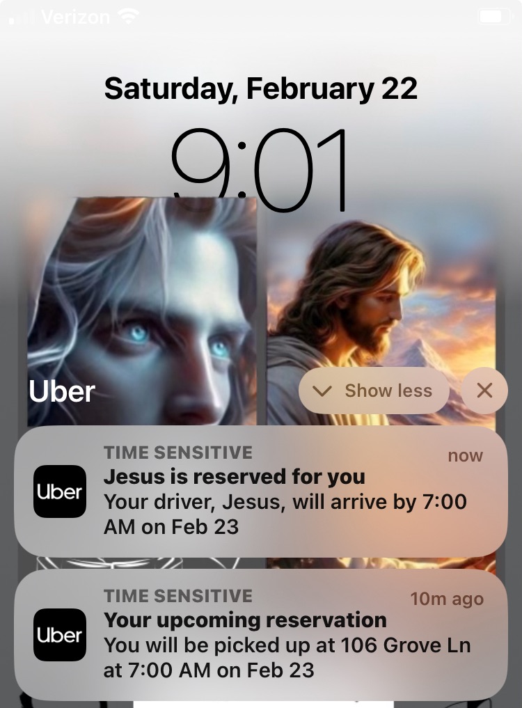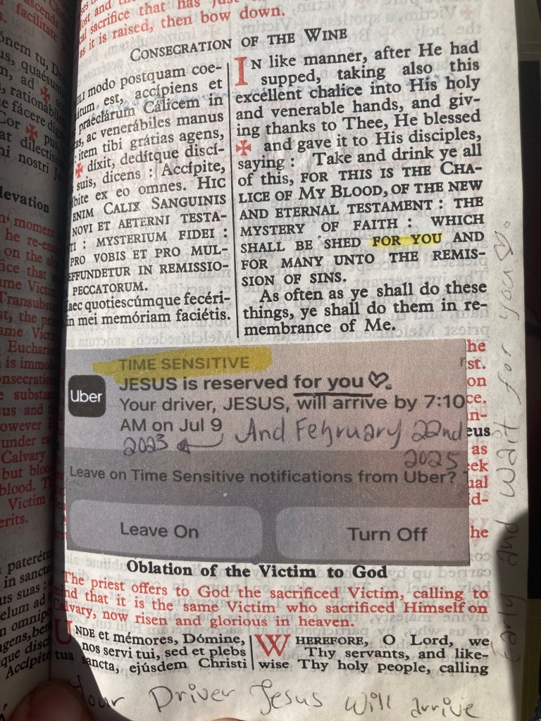 The only other time this happened to me was during another significant time in my life and it was so meaningful for me that I printed that message out of “Jesus is reserved for you” and taped it in my Mass Missal right after the words of consecration, as a “remembrance” (see what I did there?). I don’t have this screenshot on hand for some reason but the other Uber message said, “your driver Jesus will arrive early and wait for you.”