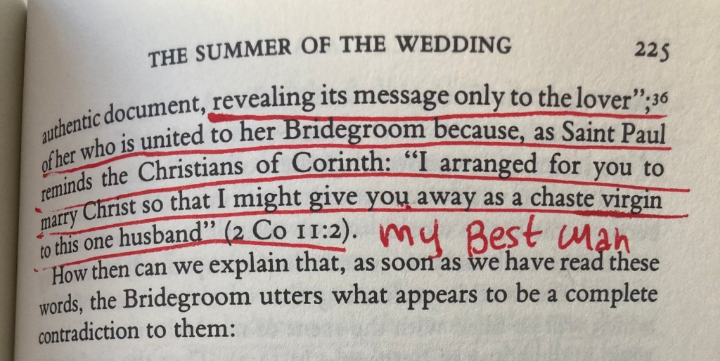 That is when I read Saint Paul’s own words about what he does for the Church, for the great “wedding”: “for I have espoused you to ONE HUSBAND that I may PRESENT YOU as a chaste virgin to Christ.” All of this is in my Saint Paul series with how he even is tied to the final passion of the Church, per the catechism and the apocalypse. I encourage you to read that three part series, but may it suffice it to say in this post that a role of any best man is to be the,