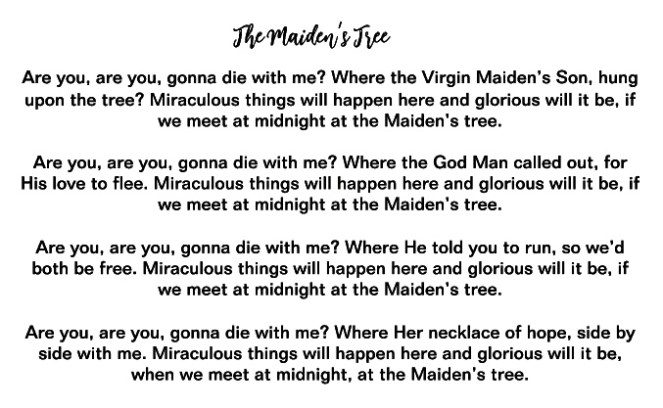 It of course entirely hit me full face that the symbol for our time is the Miraculous Medal because the image depicts a triumphant and victorious Mary, and it’s a reminder to Satan that Mary has already won. The battle’s fought; the deed is done. There is a song in the books as well as the film titled “hanging tree”(the very song I changed the lyrics to title “Maiden’s Tree”); a tune taught to Katniss by her Father before his death, but she was not allowed to sing it in public. There is a line in the films that was changed, going against the book, and when I heard it, I knew: